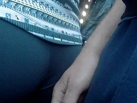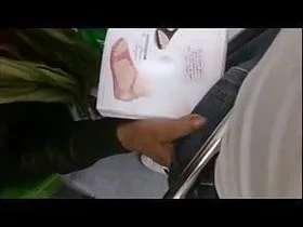 A girl who is not professional with her big breasts gives a hand job to a man.