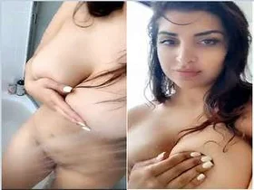 Smoking hot Desi goddess plays with huge natural XXX coconuts in bathroom