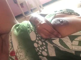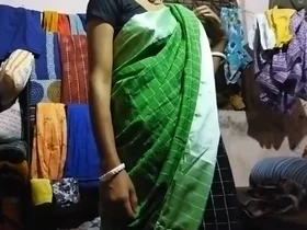 Wife Desi in a green sari fucks hubbys cock before going to bed.