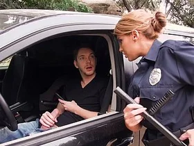 A sexy woman giving a blow job to her boyfriend in the car during their break.