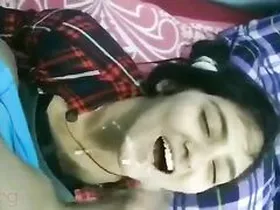 A young college student of Asian descent has cum on her face in front of a camera.