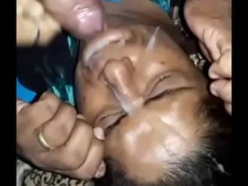 An Indian house wife gives her husband a blowjob and receive his semen on her face and in her mouth.