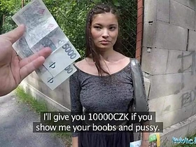 Public agent Chloe Lamoureux gets cum on her big tits for cash