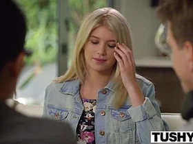 Beautiful boob revealing scene with a shy beauty giving a blow job to her cousin.